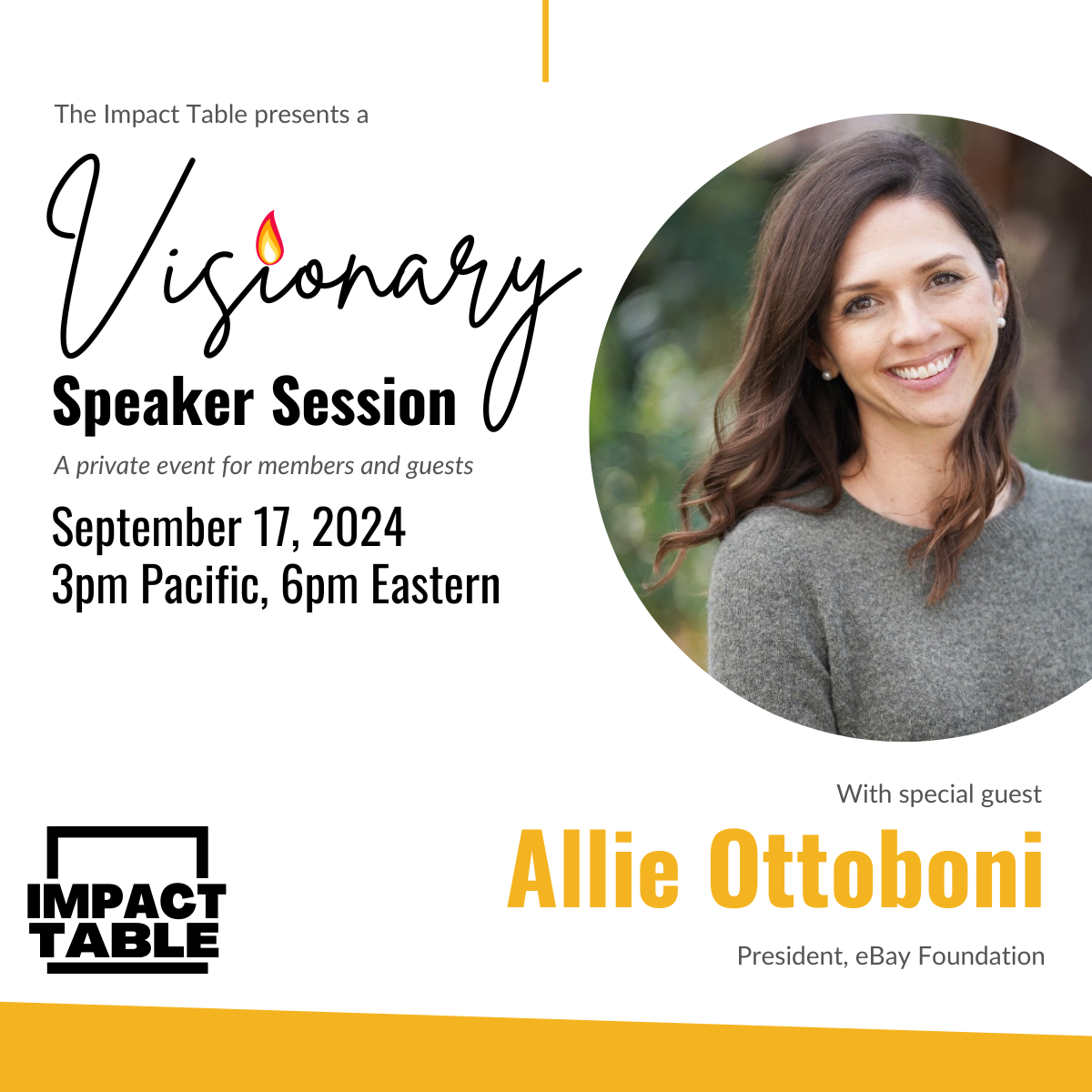Join us on September 17, 2024 for a Visionary Speaker Session for our fabulous guest Allie Ottoboni, Impact Table Member and President of the eBay Foundation.