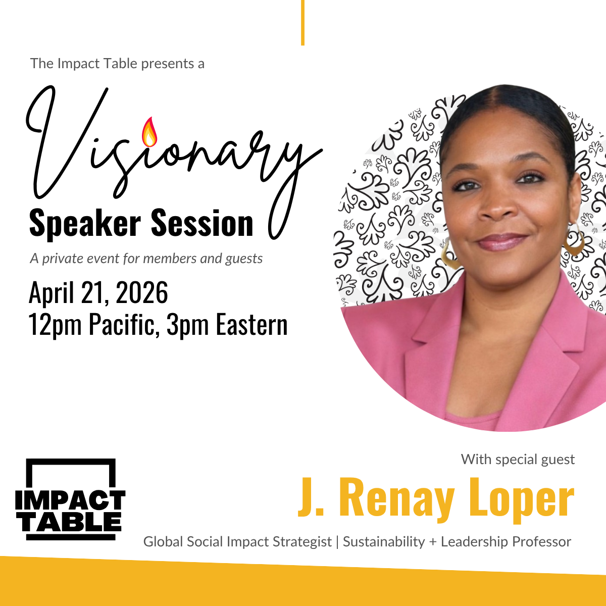 Impact Table Visionary Speaker Sessions are private member and invite-only gatherings that bring respected women leaders in impact to share about their personal leadership and impact journey and important lessons learned along the way.