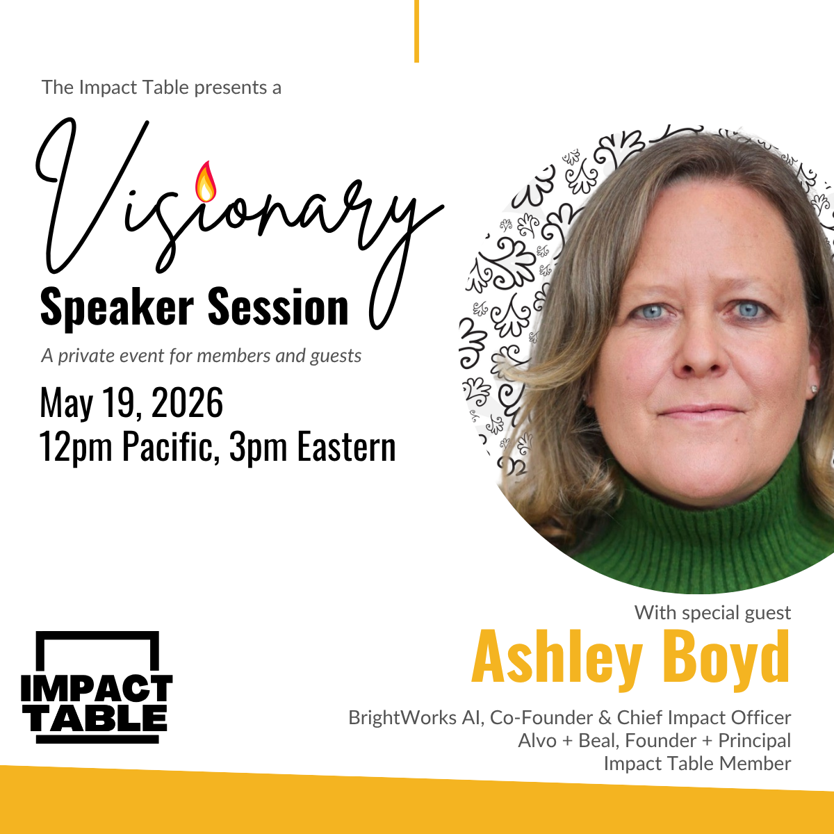 Impact Table Visionary Speaker Sessions are private member and invite-only gatherings that bring respected women leaders in impact to share about their personal leadership and impact journey and important lessons learned along the way.